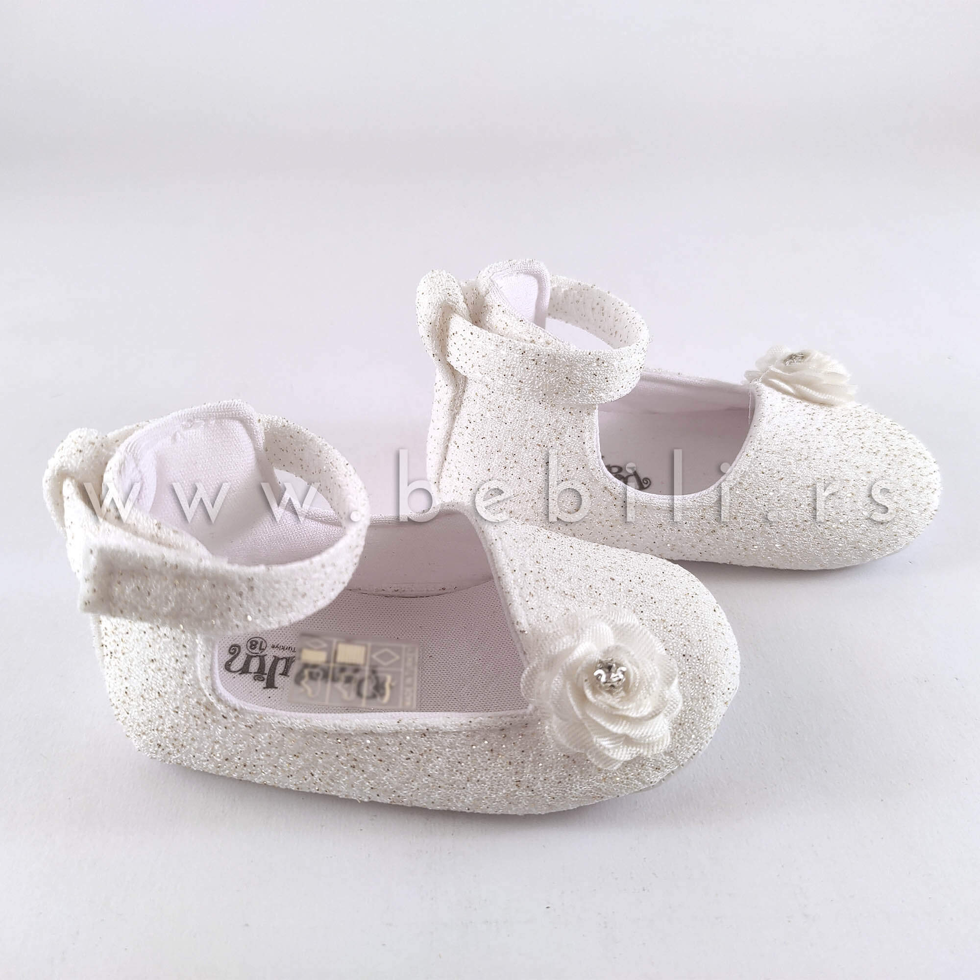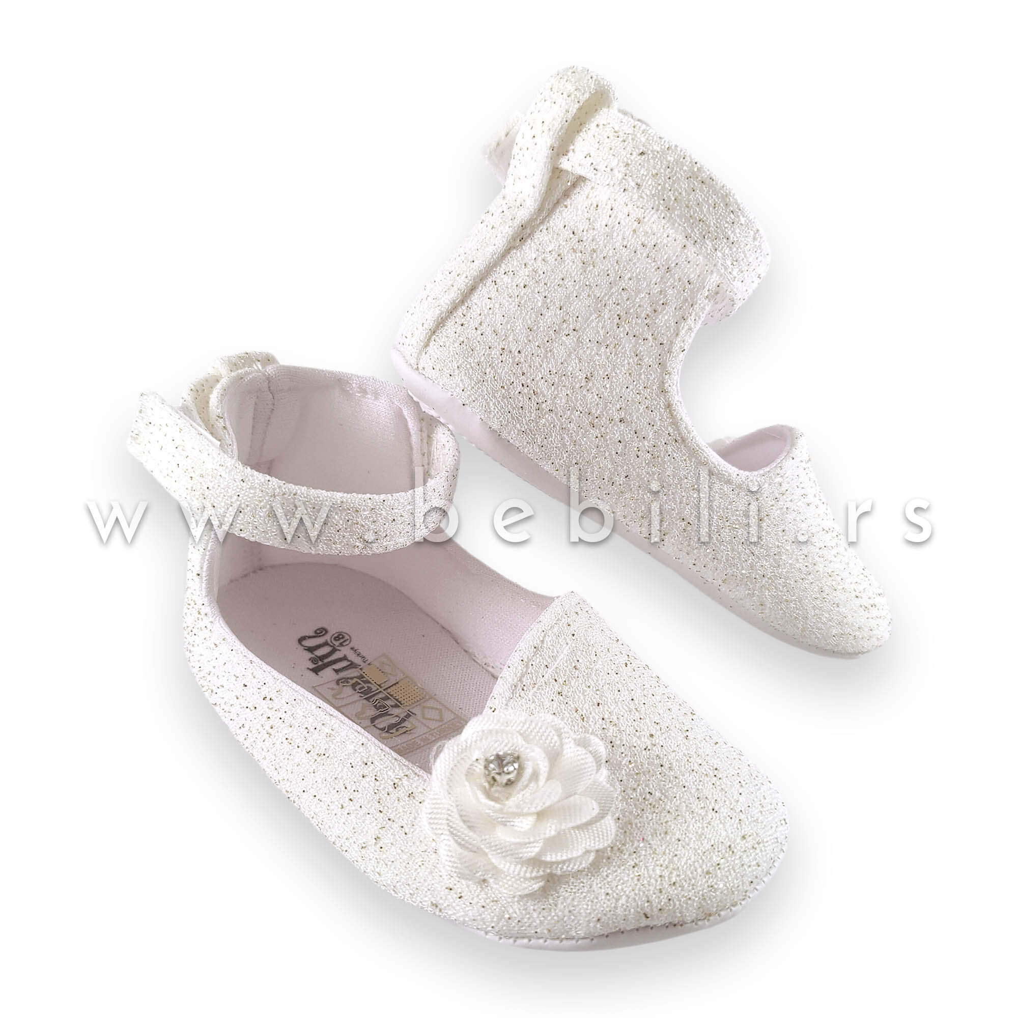 Ove preslatke baletankice za bebe su nehodajući model. Imaju mekan đon i rađene su od belog materijala sa sitnim,  zlatnim gliterom. Kopčaju se čičak trakom.