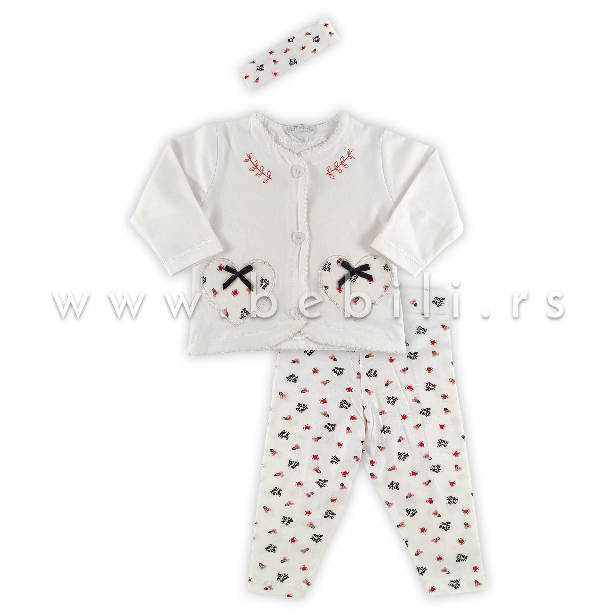 Ready kompletić za bebe koji se sastoji od donjeg i gornjeg dela i trake za kosu. Motiv srce.
