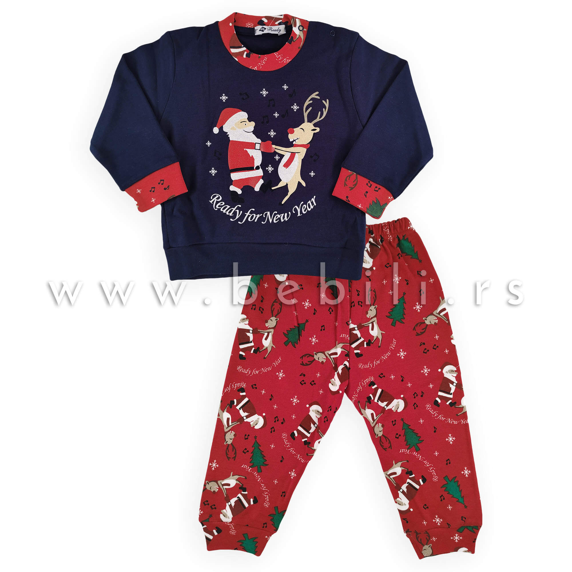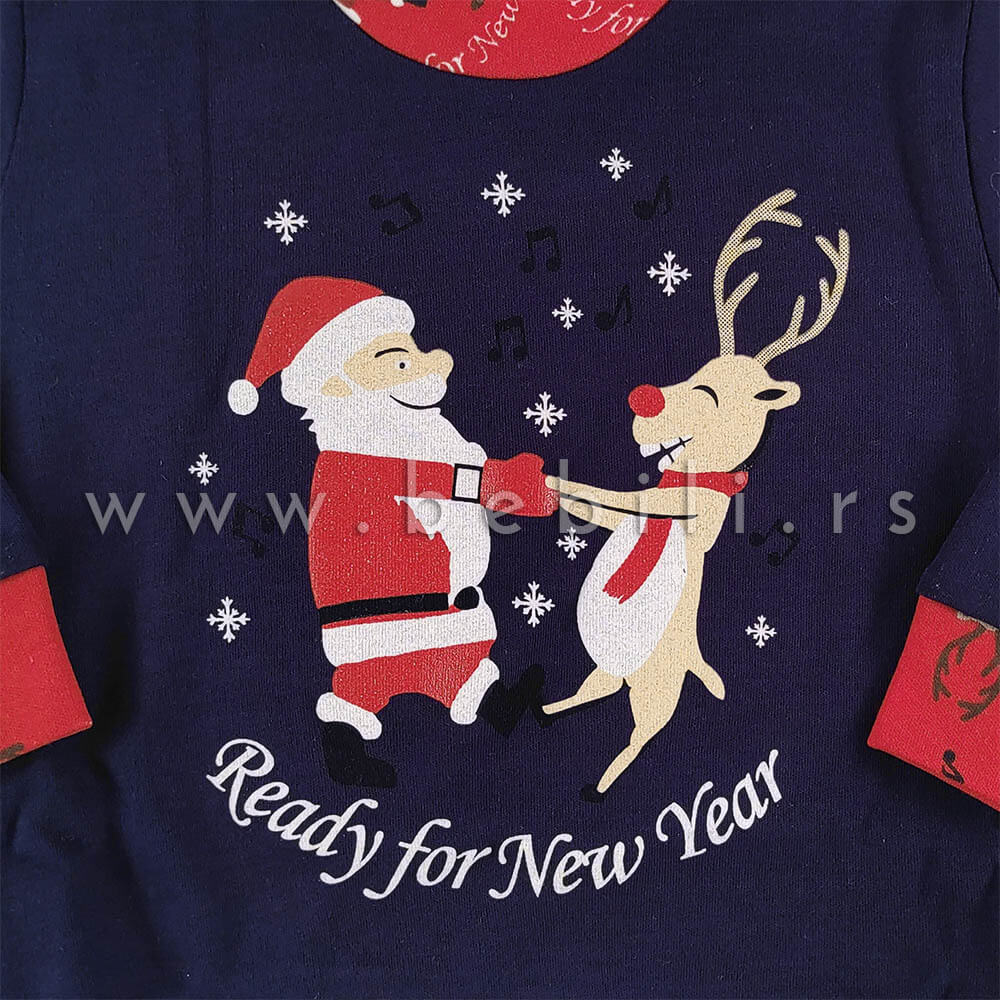 Ready pamučna pidžama za bebe sa motvima dva drugara koji se ludooo provode u novogodišnjoj noći. Kombinacija teget i crvene boje.
