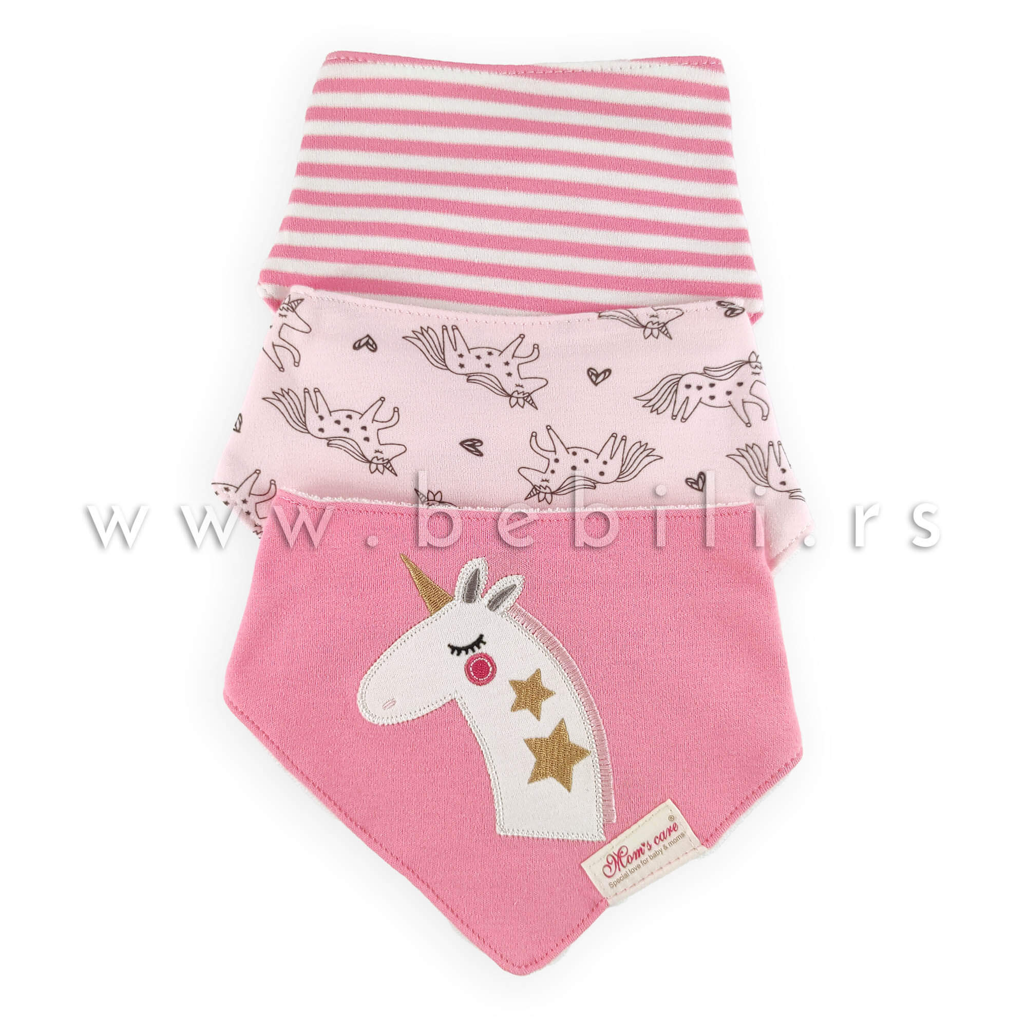 Pamučne, trouglaste portikle za bebe u pakovanju od po 3 komada, različitih dezena. Kopčanje drikerima.