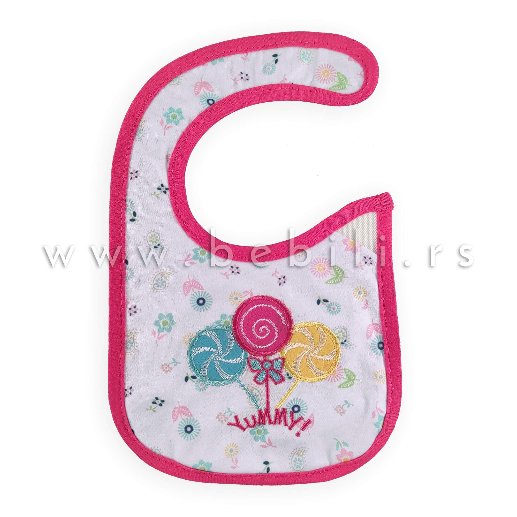 Nepromočiva portikla za bebe pink boje sa motivima lizalica. Kopča se čičak trakom.