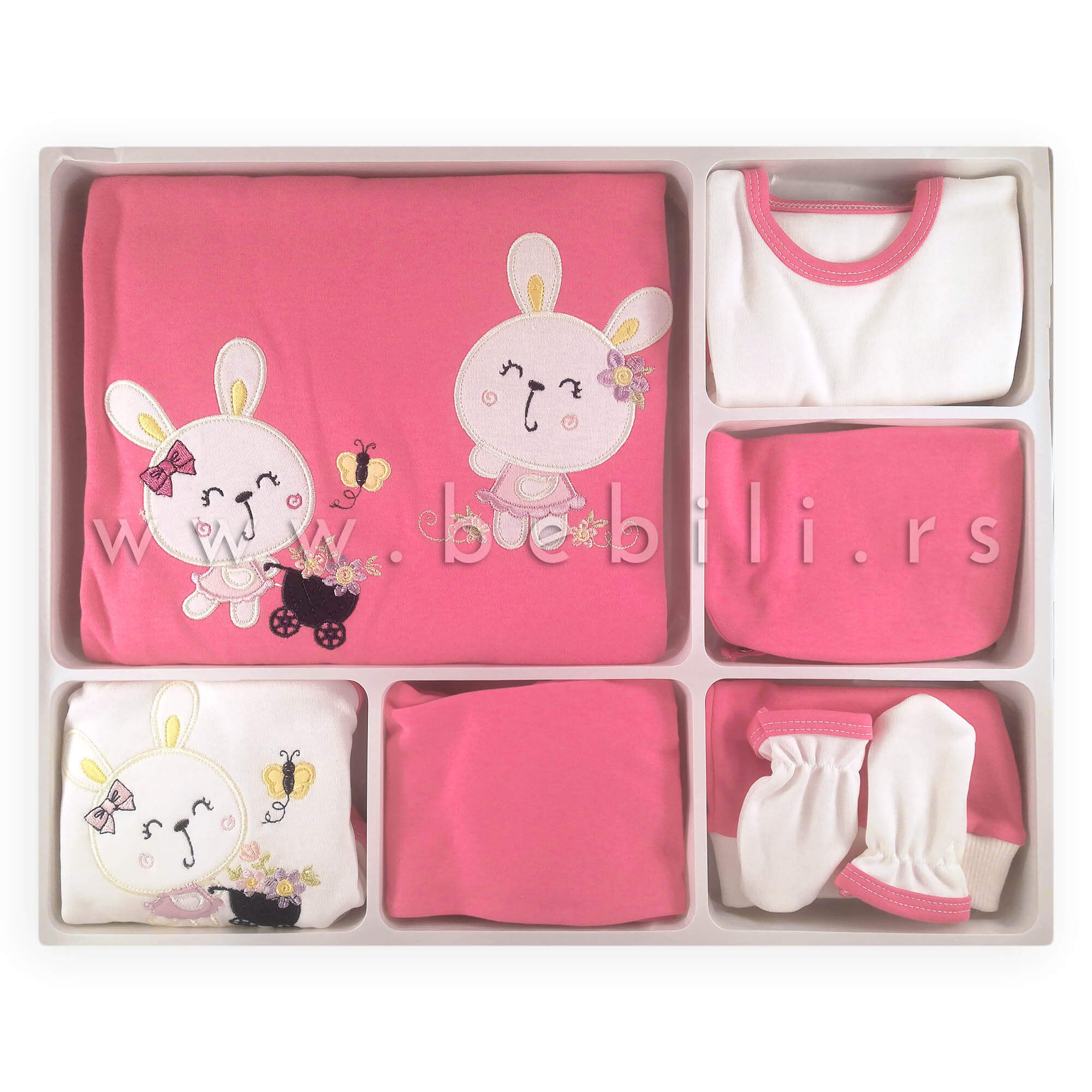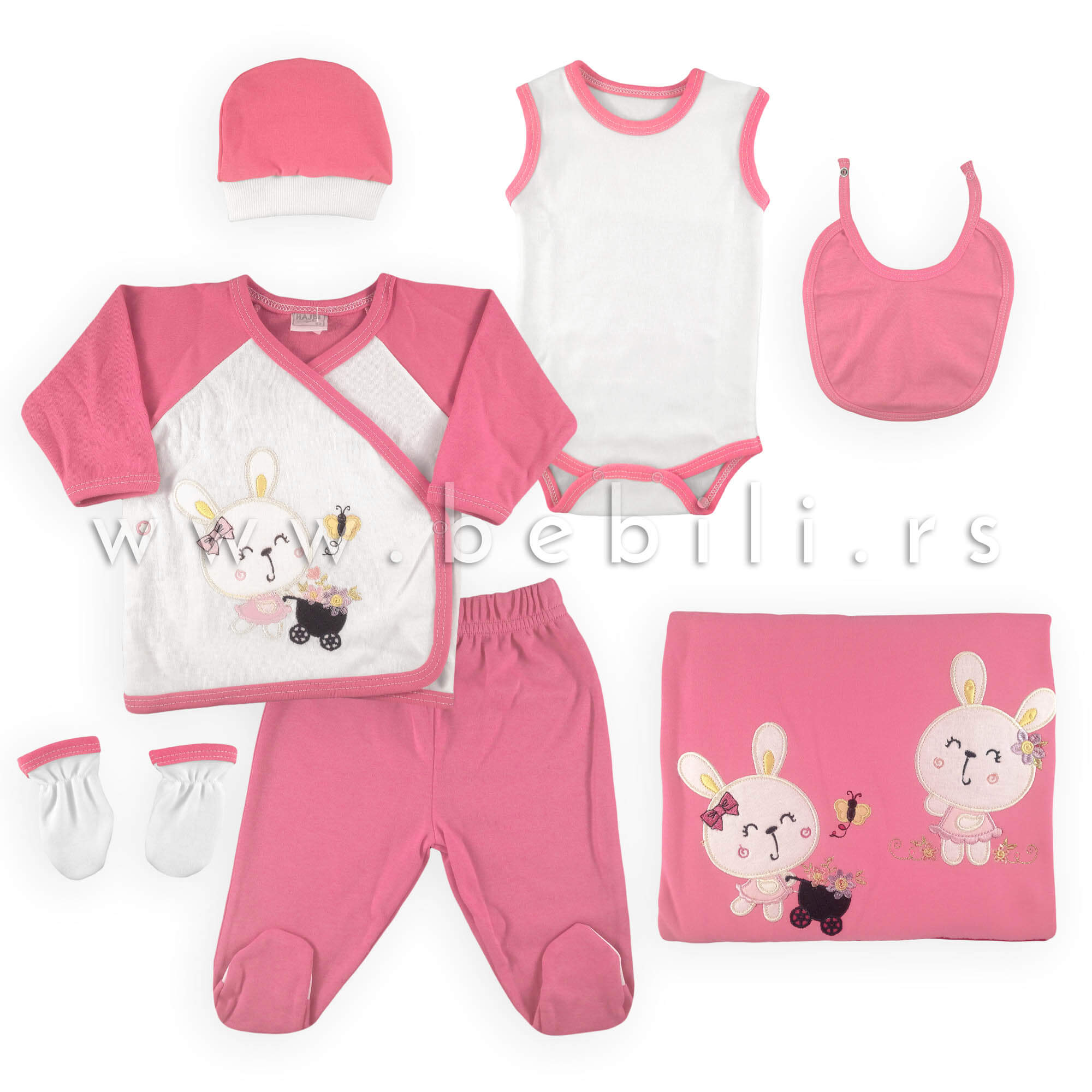 Pamučna odeća za novorodjenče u setu od 7 delova: prekrivač, benkica, pantalonice, rukavice, atlet bodi, kapica. Veličina odeće: 62