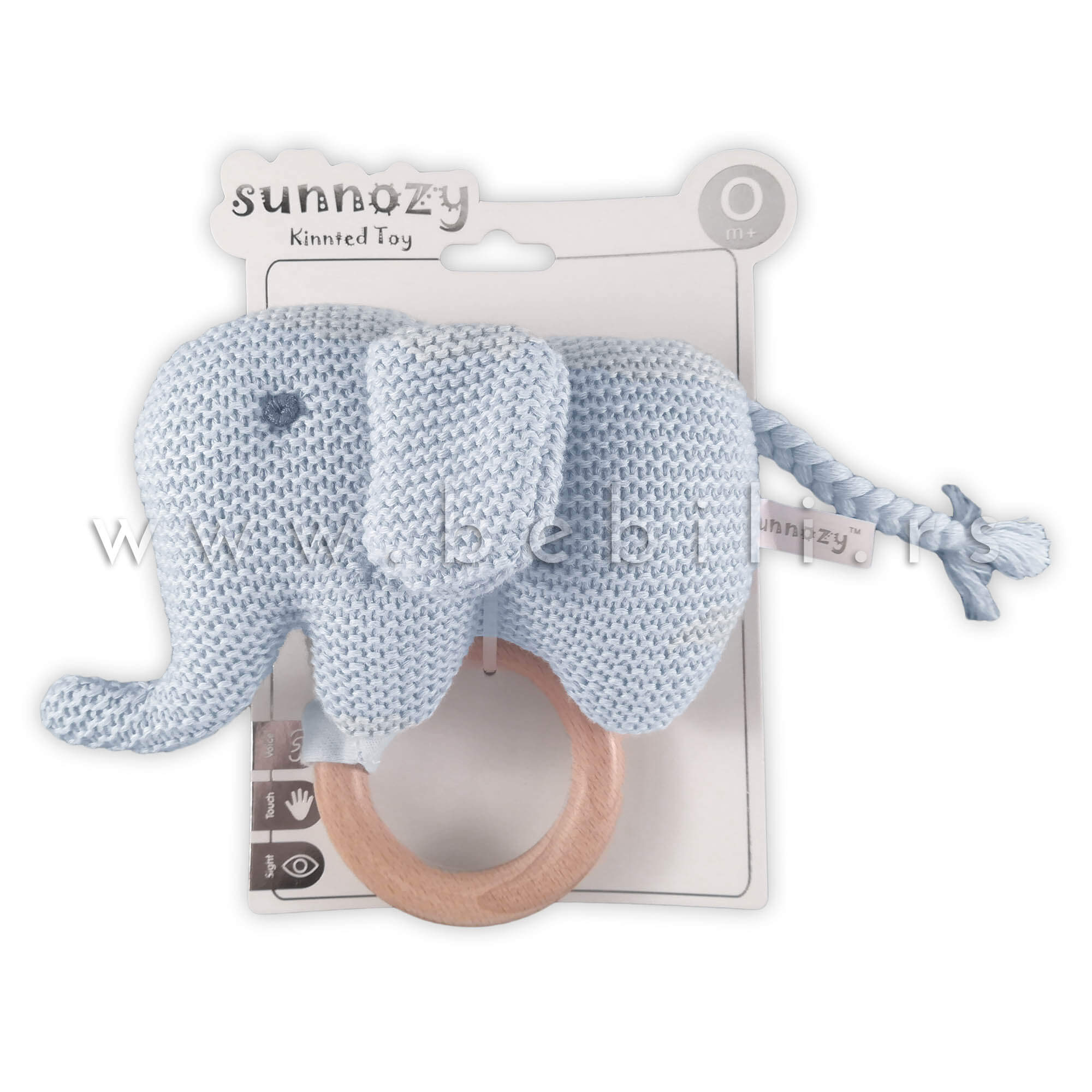 Zvečka za bebe u obliku slončeta rađena je od "pletenog" materijala. Slonče visi sa prstena koji beba može lako držati.